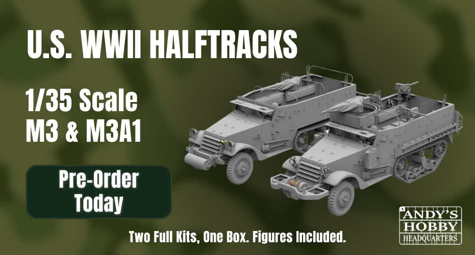 Quick view Andy's Hobby Headquarters PRE-ORDER Andy's Hobby Headquarters 1/35 M3 & M3A1 US WWII Halftracks (2 Full Kits in One Box) MSRP: Regular Price Price: Now: $82.99